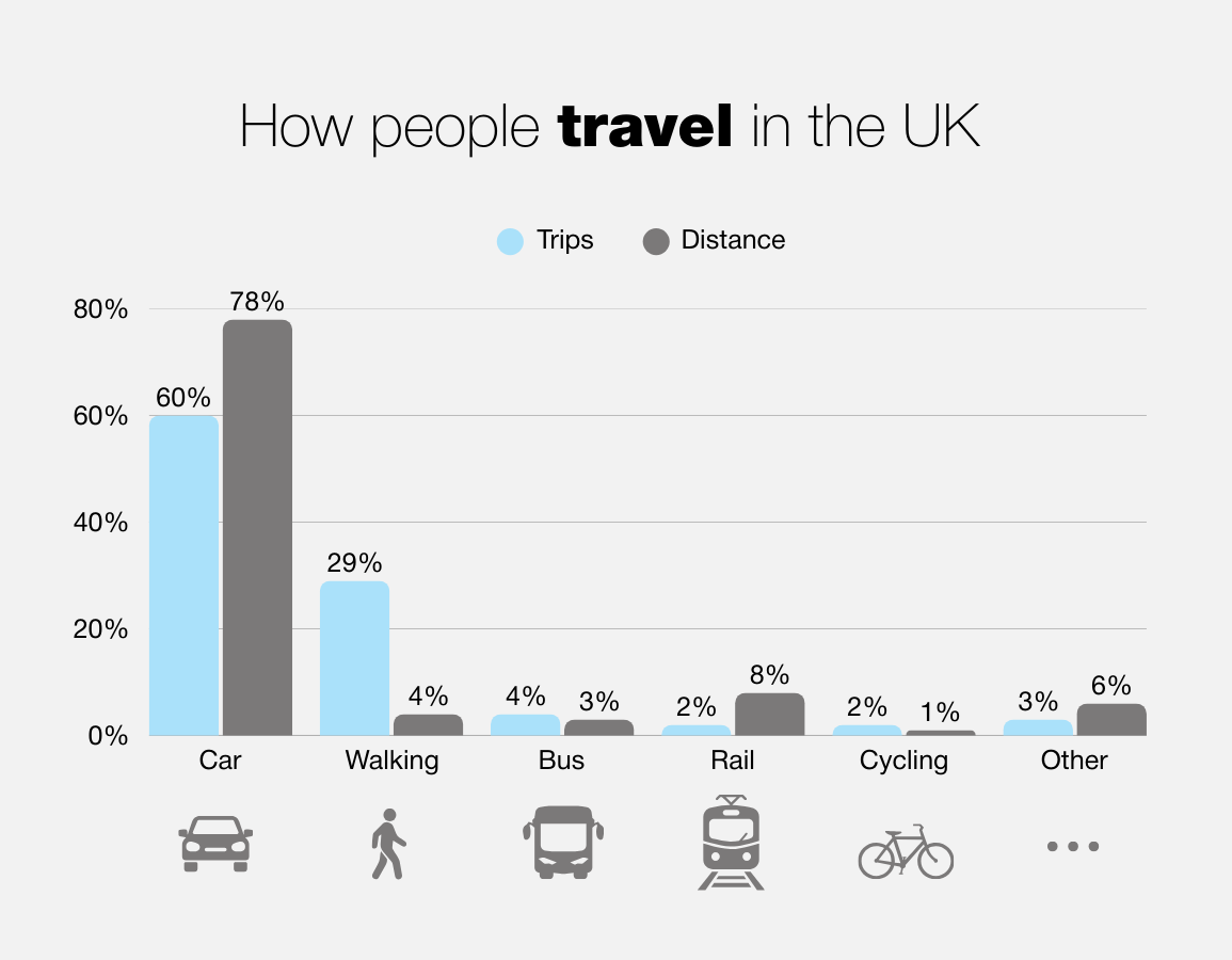 When looking at national (UK) averages for travel behaviours, we see that driving is by far the most dominant mode of transport. Personal car use typically accounts for around 60% of journeys in the UK, with public transport under 10% and multi-modal journeys (for example, cycle to train) often not accounted for [1].
