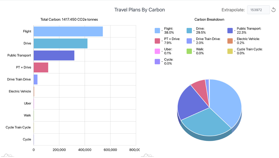 (Example: Travel-related carbon impact by mode, based on event travel data.)